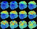 Mice with glowing hearts shed light on how hearts developThis series reveals increases in cell calcium from a mouse embryo's upper heart through the lower heart on day 10 of development. Cell calcium rises when muscles contract. The bottom row shows a dramatic slowing of the conducted calcium wave between the upper and lower heart chambers.