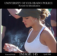 ![]() University of Colorado police have posted pictures of 150 people on a website smoking pot on the "420" day celebration last week and are offering a $50 reward for anyone who can identify them.Police spokesman Lt. Tim McGraw said they received more than 50 calls within the first hours of posting the pictures online Thursday afternoon. He said police were in the process of confirming the tips today. "I mean the phones were ringing off the hook," he said. The pictures were taken by people in the crowd at Farrand Field on April 20, a day of revelry for marijuana smokers. Anyone who knows people in the pictures is asked to call 303-492-8168. The $50 reward will be given to the first caller who correctly identifies someone pictured on the site. CU's great smoke out photo gallery. |