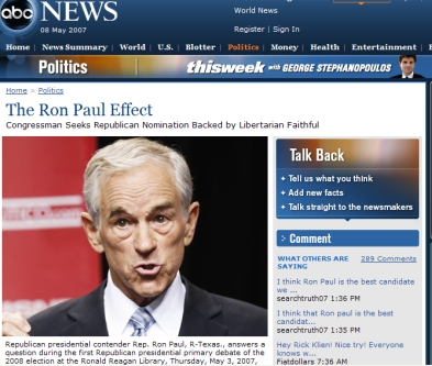 Now Yahoo! Censor Popular Support For Ron PaulABC forced to address Texas Congressman's campaign, but remain silent on why they scrubbed him from online pollBy Paul Joseph Watson Prison Planet May. 09, 2007 |