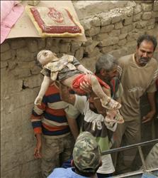 ![]() No doubt this is true; when you invade a country for no reason, drive it into ruination, chaos and civil war, then continue to occupy it year after year, why then, sometimes the natives will get restless and fire back at you. In such situations, the best method of "force protection" is not to call in airstrikes and missile attacks on crowded civilian neighborhoods and kill two-year-old children -- but to REMOVE your forces from the invaded land altogether, and stop using them to perpetuate a war crime that has already caused the death of a million innocent people. Yet the plain, common-sense logic of this proposition continues to elude our military and political leaders -- including the two "progressive" presidential candidates -- and all of the "serious" analysts of public policy as well. So for years to come, we will continue to see pictures such as the one above -- for which As'ad AbuKhalil, the "Angry Arab," provides an apt caption: What? This two-year child? Well, he was killed in US bombing on Sadr city but there is evidence that he was one of the commanders of the Mahdi Army.But here we must disagree with the esteemed professor; surely the child was an Iranian belligerent, a Quds Force officer, committing acts of war against the United States at Tehran's order. Surely now we should put our new "Attack Plan" against Iran into action, before any more of these two-year-old evildoers who hate us for our freedoms can try to destroy our shining city on the hill. |