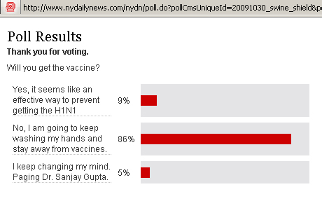 NYDailyNews Poll: Will you get the swine flu vaccine? 86% Say No.InformationLiberationNov. 05, 2009 |