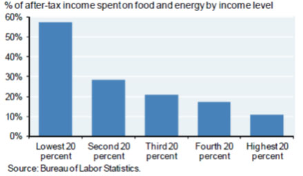![]() The following chart prepared recently by JPMorgan demonstrates something rather scary, and makes it all too clear how the Chairman's plan to "assist" the US population via some imaginary "wealth effect" due to QE2, is about to backfire. As is now becoming very evident, the prices of energy and food products are about to surge, and in many cases have already done so, but courtesy of some clever gimmicks (Wal Mart selling what was formerly 39 oz of coffee as a 33.9 oz product for example) the end consumers haven't quite felt it yet. They will soon. There is a limit to how much every commodity can open limit up before it appears on the SKU price at one's local grocer. And while a marginally declining "core CPI" is irrelevant for this exercise as it measures only items that are completely outside of the scope of everyday life, what will be far more important to end consumers will be the push higher in food and energy costs. The problem, however, is that for the lowest 20% of Americans, as per the BLS, food and energy purchases represent over 50% of their after-tax income (a number which drops to 10% for the wealthiest twenty percentile). In other words should rampant liquidity end up pushing food and energy prices to double (something that is a distinct possibility currently), Ben Bernanke may have very well sentenced about 60 million Americans to a hungry and very cold winter, let alone having any resources to buy trinkets with the imaginary wealth effect which for over 80% of the US population will never come. Here is how JPM explains the phenomenon: When the Fed considers the possible consequences of a falling dollar resulting from QE2, it should perhaps focus on food and energy prices as much as on traditionally computed core inflation. First, the food/energy exposures of the lower 2 income quintiles are quite high (see chart). Second, the core CPI has a massive weight to “owner’s equivalent rent”, which suggests that the imputed cost of home occupancy has gone down. Unfortunately, this is not true for families living in homes that are underwater, and cannot move to take advantage of it (unless they choose to default and bear the consequences of doing so). Due to the housing mess, there has perhaps never been a time when traditionally computed core inflation as a way of measuring changes in the cost of things means less than it does right now.Since nothing else appears to have jarred America from its prime time TV/iPad hypnosis yet, perhaps this is for the best, and a few hungry months in subzero temperatures is precisely what several tens of millions of Americans need to finally march on Constitution avenue. |