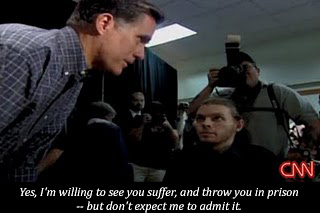 ![]() Mitt Romney, a polymer-based life form of nearly limitless pliability, is as long on cash as he is short on genuine convictions. For the Power Elite's political brokers, few traits are more endearing in a potential president than malleability. Romney's suppleness of spine helps explain how he was able to soak up $10 million in promised campaign donations from politically connected oligarchs during a day-long marathon fundraiser in Las Vegas.Seeking an issue on which Romney takes a binding, definitive stand often seems like trying to overtake the horizon. Clayton Holden, a wheelchair-bound man and long-time medical marijuana patient, may be the only person who has ever seen Romney perform a plausible impression of Martin Luther ("Here I stand, I can do no other") regarding any subject. Holden suffers from Duchene Muscular Dystrophy, an affliction that has left him with a twisted spine, inflamed nerve bundles, and unremitting chronic pain. When Holden was 16, his suffering was compounded when he was hit by a car while crossing the street in his wheelchair. Like many others who suffer from debilitating pain, Holden has found that marijuana offers him relief while inflicting none of the side-effects that accompany many government-approved drugs. On at least ten occasions, Holden has been confronted by police, who – to their credit – have been willing to flout what they are required to call "the law" in favor of elemental decency. It’s only a matter of time before some armed functionary will be found who is sufficiently vicious to throw Holden in a cage. That’s the outcome that Mitt Romney would favor. During an October 7, 2007 Republican presidential forum in New Hampshire, Holden politely but forcefully confronted Romney to ask him the same question he had posed to other candidates (only one of whom – no extra credit for guessing which one – actually gave him an unequivocal answer): Since Holden has to use marijuana to treat his affliction, would Romney be willing to see him and his doctors arrested and carried off to jail? Romney, as is his habit, tried to take refuge in persiflage, insisting – on the basis of what qualifications, he didn’t say – that synthetic marijuana would work just as well. He then sought to ooze his way out of the question by quipping that he doesn’t "arrest anyone." The most remarkable aspect of Romney’s encounter with Holden is that he displayed none of his characteristic equivocation in defending drug prohibition. He yielded not so much as a millimeter in his insistence that medical marijuana is a "gateway drug"; this means that Holden and other patients who use it either have to settle for useless or harmful government-approved treatments or endure the punitive wrath of the divine State. The Mittster didn't even seek to palliate the feelings of this powerless, suffering individual by deploying a sympathetic platitude. Presidential politics in our putrefying empire deals in the infliction of wholesale cruelty – through the destruction of wealth, the propagation of aggressive violence, and the constriction of individual liberty. Like most people who aspire to the imperial purple, Romney doesn't like to be seen dispensing cruelty on an individual basis, which is why he ended the conversation with Holden as quickly as possible, and was palpably angry that this uncomfortable moment was caught on camera. Owing to the influence of big-money campaign donation "bundlers," and dubious bookkeeping of the sort that that is common among the politically protected Wall Street denizens who favor he ardently courts, Romney has emerged as the fundraising front-runner among GOP presidential aspirants. As Romney campaign minion Chris Slick memorably put it during the day-long grovel-fest in Vegas: "Today we demonstrate our ability to raise excessive and ungodly amounts of cash while other candidates are still pattering about in bumf*ck, Iowa somewhere. No one can come close to what our machine can do. No one." By "our machine," Slick wasn't just talking about Romney's political campaign; he was referring to an interlocking network of pressure groups, lobbyists, and political criminals who support, sustain, and profit from the Warfare State. Slick himself is director of online operations for "ACT! for America," an anti-Muslim pressure group whose founder and chief spokesperson, Lebanon-born Brigette Gabriel (nee Nour Saman), tirelessly evangelizes on behalf of a war of annihilation against Islam. In a 2007 address at Rev. John Hagee's mega-church, Gabriel insisted that Muslims "have no soul". This which would mean, of course, that Muslims aren't merely mistaken or sinful, but that they aren't genuinely human. There are many pressure groups who promote various elements of the War Party agenda ala carte. Gabriel's group will settle for nothing less than the Full Cheney combo meal: Permanent war abroad, unlimited regimentation at home, indefinite detention of suspected terrorists, institutionalization of torture, and so on. It's worth pointing out that during the 1980s, Gabriel – under her birth name – was a correspondent/propagandist for a television network affiliated with the South Lebanon Army (SLA). During the horrific Lebanese civil war – a multi-sided conflict in which no belligerent had a monopoly on unspeakable acts – the SLA was an Israeli-supported militia that ran a notorious torture dungeon called Al Khiam Prison. Many of the methods now employed by Washington's Homeland Security State – those not devised by the CIA, or reverse-engineered from Soviet sources, that is – were field-tested on detainees in the Al Khiam prison. While Romney is connected to all of this by the only most tenuous of threads, it's important to remember that he has spoken of the supposed need to "double Guantanamo" – that is, to expand the use of indefinite detention and the application of torture techniques that have been cloaked in the Gestapo-derived euph