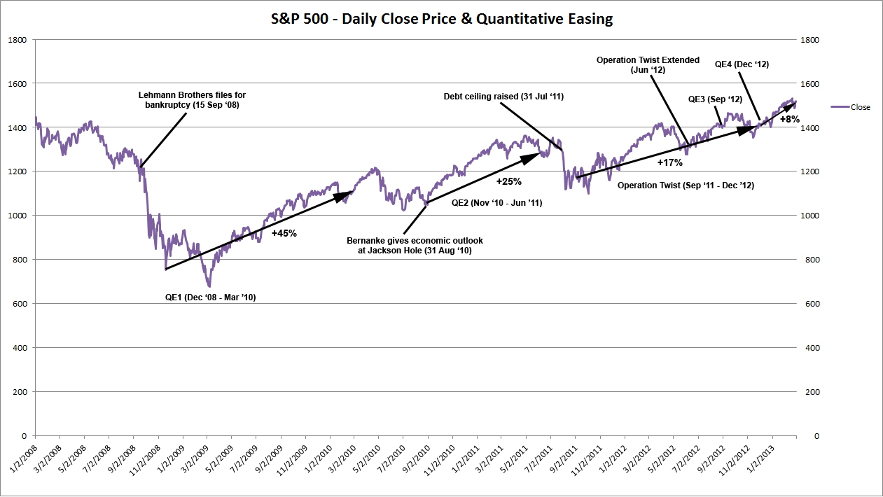![]() After selling off an astounding 56% between October of 2007 and March 2009, the S&P 500 has staged a rally for the ages, surging 120% and recovering all of its lost ground too. This stunning turnaround certainly qualifies as one of the more memorable, and unusual, stock market rallies in history. The problem is that the rally has been underwritten by the Federal Reserve's unconventional monetary policies But for some reason, this belief has not weakened the celebration. Although the Fed has been tinkering with interest rates and liquidity for a century, nothing in its history could prepare the markets for its activities over the last four years. (See 'The Stimulus Trap' article in my latest newsletter). And while most market analysts give credit to Ben Bernanke for saving the economy and sparking the rally, they have not fully grasped that market performance is now almost completely correlated to Fed activism. A detailed look at stock market movements over the past four years reveals a clear pattern: upward movements are directly tied to the delivery of fresh stimulants from the Fed. Downward movements occur when markets perceive that the deliveries will stop. In other words, the rally is really just a bender. The rest is commentary. Since 2008, the Fed has injected fresh cash into the economy with four distinct shots of quantitative easing and has added two kickers of Operation Twist. In recent months, the Fed has dispensed with the pretense of designing, announcing, and serving new rounds of stimulus and is now continuously monetizing over $85 billion per month of Treasury and mortgage-backed debt. The new cash needs a place to go, and stocks, which now often provide higher yields than long term Treasury bonds, and which offer much better protections against inflation, provide the best outlet. But the four year rally has been punctuated by several sharp and brief drops. It is no coincidence that these episodes occurred during periods in which the delivery of fresh stimulus was in doubt. If the Fed were ever to follow through on its promise to exit the bond market, we believe the current rally would come to an immediate halt. This provides yet another reason to believe that stimulus is now permanent. A close look at the performance of the S&P 500 over the past four years tells the story. Source: Yahoo! Finance, Euro Pacific Capital. Past performance is no guarantee of future results. (Click here to enlarge) In May 2007, with the "Goldilocks" economy of 2005 and 2006 still in control, the S&P finally eclipsed the March 2000 high of the dotcom era. It ultimately hit an all-time high of 1565 in October 2007. But later in the year, things began to unravel when bankruptcies of premier subprime lenders signaled real trouble. A blood bath, though, did not materialize. As late as August 2008, the S&P was trading at nearly 1300, down a less-than-tragic 16% from its high. But when Lehman Brothers, Fannie Mae and Freddie Mac, and AIG imploded almost simultaneously in September 2008, the markets panicked. Hundreds of billions of dollars of potentially worthless debt now sat on the books of the nation's financial system. No one knew where the next bomb would explode. A stampede thus ensued. (A minor replay of this dynamic just occurred in Cyprus. See my recent commentary for more on this). Less than a month later the index fell below 900, a fall of more than 30%. By November 21, the S&P had lost another 100 points. Four days later, the Fed introduced the first round of what would come to be commonly known as "quantitative easing". This consisted of purchasing $600 billion of government-sponsored enterprises debt and mortgage-backed securities. By the day of the announcement (even though nothing had yet been done), the S&P rallied almost 50 points to 851. Still encouraged by the Fed, the S&P was at 931 on January 6, 2009, significantly higher than in late November. Despite the first round of asset purchases, the market was still in chaos and had not yet stabilized. By early March, the S&P had lost an additional 25%, bringing total "peak-to-trough" losses at more than 50%. On March 18, 2009, the Fed announced that it was going to expand the size of its stimulus program. This time it really got the stock market's attention. The new guidelines called for a total purchase of $1.25 trillion of MBS and $300 billion of Treasury debt. On the day of the announcement, the S&P opened at 776 and by the time the asset purchases were complete a year later, in March 2010, the S&P was trading at 1171, an increase of 50%. When the spigots of quantitative easing shut down in the second quarter of 2010 the S&P turned south, declining to a low of 1022 in July (a 13% decline from March). In late August, just before Bernanke delivered his 2010 Jackson Hole speech, in which he would hint at the next round of stimulus (to be later dubbed "QE2"), the S&P was still hovering a full 10% below its post QE1 high. But the expectation of another shot was enough to ignite a rally. When the formal announcement of QE2 came in November, the index had already advanced to 1193. When the program expired at the end of the 2nd quarter of 2011, the S&P stood at 1307, a 25% increase from before Bernanke jawboned the markets at Jackson Hole. The market response to QE2 was in many ways similar, if less spectacular, than its prior response to QE1. And like the first go-round, the rally ended with the withdrawal of stimulus. In addition, after the cessation of QE2, the markets had to contend with the farce of the U.S. debt ceiling drama. As a result, the S&P declined from a high of 1343 on July 22 to 1123 by August 19, a drop of 16%. This is also the same time period when the U.S. received its downgrade by Standard and Poor's. Ironically, the U.S. eventually got a temporary reprieve from the spotlight when its problems became overshadowed by funding tensions in Greece and Southern Europe, causing the market to once again flock to the so-cal