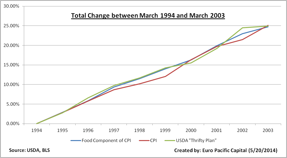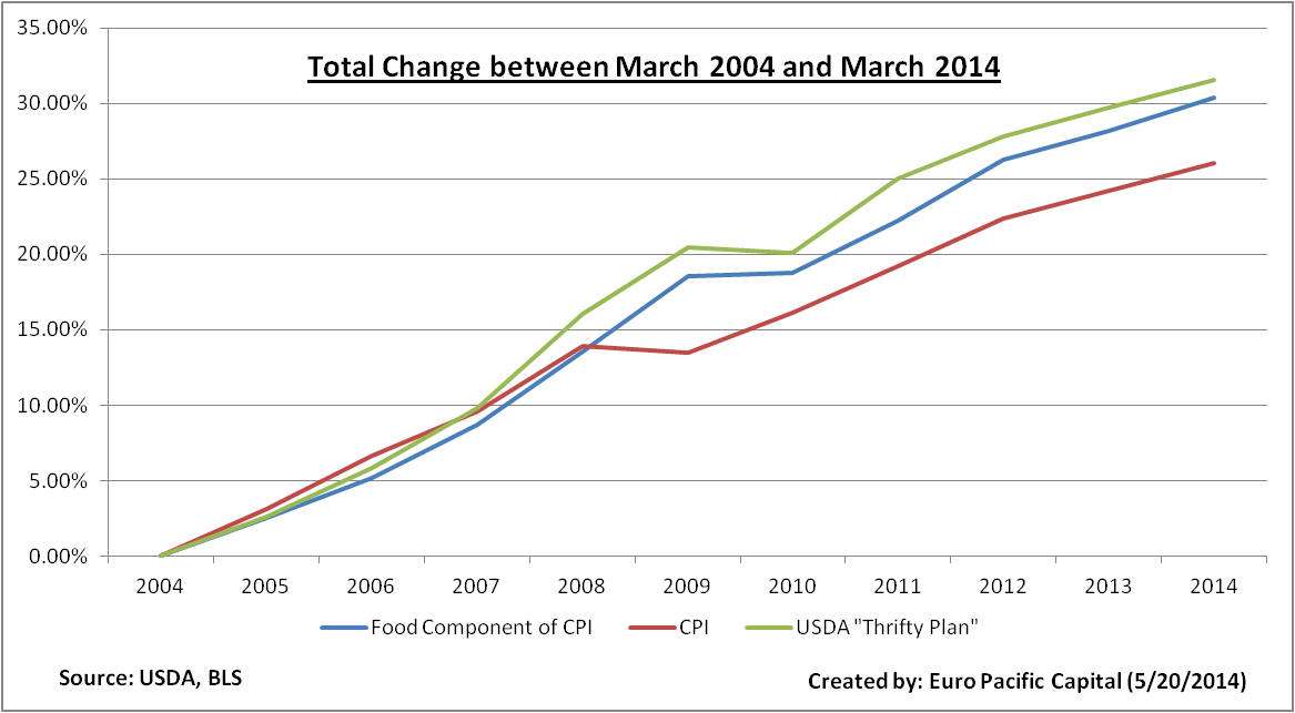 ![]() In this week’s release of the minutes from its April 29-30 meeting, Federal Reserve policymakers made clear that they see little chance of inflation moving past their 2% target for years to come. In order to make such a bold statement, Fed economists not only had to ignore the current data, but discount the likelihood that their current stimulus will put further upward pressure on prices that are already rising. Even if you believe the highly manipulated government CPI data, April’s year over year inflation rate came in at 1.95%, a statistically insignificant difference from the Fed’s 2% target. If annualized, April’s monthly change would equate to a rate closer to 4%. On the producer side, the numbers are even worse. Last week the Producer Price Index (PPI) came in at .6% for April, after notching up .5% in March. These two months together annualize at 6.6%. So already there is very little wiggle room, if any, before the Fed reaches the point where even its dovish leaders should admit that inflation is a problem. But like most modern economists, leaders at the Fed deny Milton Friedman’s famous maxim that inflation “is always and everywhere a monetary phenomenon.” Instead they like to think of it as a kind of pesky but necessary byproduct of economic growth. (Recently the theory has gone even further, mixing cause and effect to determine that inflation causes economic growth). If this were so, then the Fed would have a lot to worry about if its economic forecasts can be trusted. Despite the muted economic statistics over the last few months, the Fed has not backed off Janet Yellen’s 3.0% forecast for 2014 GDP. The near zero growth we saw in Q1 (likely to be revised negative) has not convinced her, or anyone at the Fed, to ratchet down this estimate. So to hit that target, growth for the remainder of the year will have to come in close to 4% per quarter. If the economy finally picks up to that level, by throwing off the supposedly chilling effect of the past winter, then based on the Fed’s views it should expect significant upward pressure on inflation. Yet nowhere in the minutes released today is that possibility even considered. In fact, they explicitly said that inflation would be well below 2% for the next few years, despite the fact that it’s already at 2% right now...during a period of admitted weakness! So they expect the economy to grow and inflation to subside even while real interest rates stay deep in negative territory? In essence, they are writing a new economic textbook on the fly. In truth, they are simply stringing together words and ideas designed to soothe the market and to keep anyone from detecting the dangerous trap that they have led us into. So just as the Fed saw no risk of housing prices falling in 2006, they see no risk of consumer prices rising now. In fact, they are just as confident that inflation is “contained” as they were about the sub-prime mortgage crisis. Based on their track record, people should fear exactly what the Fed is not worried about. In the meantime, the truth about inflation is bubbling up in some unexpected places, sometimes from the same government that tells us that it’s not a problem. In order to calculate the payment levels for the SNAP Food Program (aka “Food Stamps”), The U.S. Department of Agriculture is responsible for providing a baseline estimate for the costs needed to feed the typical family that would qualify for the program. Looking over a twenty-year time frame provides a revealing pattern that we have seen in other places (see Big Mac Index). From 1994 to 2003 the CPI rose by a total of 25% or about 3.2% per year. This is almost exactly the same change that was seen in both the food component of the CPI and the USDA SNAP estimates for their “thrifty” plan to feed a family of four (the “thrifty” plan is the least expensive) over the same period. But that all began to change in the early part of the current century as the costs began drifting apart from the official CPI. I have made the case many times that this occurred as a result of changes in the way the CPI is calculated, all of which were designed to conceal the true level of inflation. From 2004 to 2014 the CPI was up 26% or about 2.5% per year. However, the food component of the CPI was up 30% and the USDA estimate for a family of four was up 32% (The higher cost “liberal plan” increased even more, at 35% over that time). When comparing two sets of government data, it’s tough to credit one over the other. But the USDA data is likely much closer to what most of us who shop for food actually experience. If accurate, the USDA numbers mean that over the past decade the costs to actually feed a family increased 23% more than most economists like to tell us. Rising food prices are a major problem for many Americans struggling to make ends meet in our listless economy. Exactly how much more pain does the Federal Reserve want to inflict on the middle and lower classes before it relents and stops creating even more inflation? There is a growing belief among economists, highlighted in a recent debate I had with Nouriel Roubini, that higher prices are actually a benefit to consumers. They believe that the growth created by inflation is worth more than the cost imposed at check-out lines. Instead, we are simply getting another dose of 1970s-style stagflation as higher prices simply amplify the pain of a stagnant economy and diminished employment opportunities. The good news for Roubini and his ilk is that inflation does indeed help some people...the very rich. I have long argued that Fed stimulus and quantitative easing only result in the formation of asset bubbles that unevenly favor the rich, while misdirecting capital away from savings and productive investments that would benefit everyone else. Economists had blamed the recent disappointments from mass-market retailers like Walmart, Target, Best Buy, Staples, Dick’s Sporting G