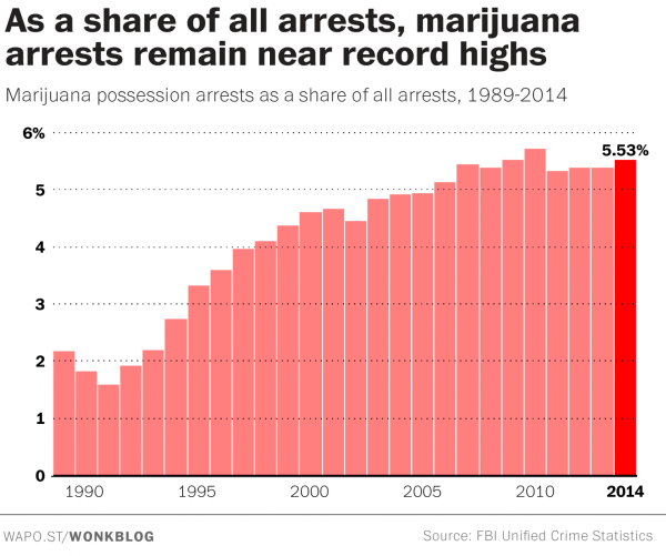 ![]() According to the latest national data released by the FBI, at least 620,000 people were arrested for simple marijuana possession alone last year – a rate of 1,700 people per day, or more than 1 per minute. The numbers, which are under-counted as some states don’t report arrest stats to the FBI, or do so on a limited basis – illustrate that more than 1 in 20 arrests were for simple marijuana possession in 2014. Near beginning of the drug war, fewer than 2 percent of arrests were for pot possession – a rate that rose steadily throughout the 1990s and 2000s. Even as marijuana arrests are plunging in states like Washington and Colorado that have legalized recreational marijuana markets, the national trend is still climbing upward – meaning that some jurisdictions are ramping up the drug war even as a majority of people embrace legal weed. “It’s unacceptable that police still put this many people in handcuffs for something that a growing majority of Americans think should be legal,” pro-legalization group Marijuana Majority spokesperson Tom Angell said. “There’s just no good reason that so much police time and taxpayer money is spent punishing people for marijuana when so many murders, rapes and robberies go unsolved.” The FBI numbers show that over 50 percent of violent crimes, like murder, rape and assault, went unsolved last year in the United States. “These numbers refute the myth that nobody actually gets arrested for using marijuana,” Marijuana Policy Project spokesperson Mason Tvert said. “It’s hard to imagine why more people were arrested for marijuana possession when fewer people than ever believe it should be a crime.” States including California, Arizona and Nevada are planning on putting marijuana legalization measures on the ballot in 2016. As more states legalize the drug, the disparities in state-level drug enforcement are expected to draw more notice. The total number of marijuana arrests may be declining slightly as states refuse to purse possession charges for the drug, but its important to note – that as previously mentioned – the percentage of total arrests that result from petty drug charges are on the rise. The data also shows that drug violations are the number one cause of arrest in America and that marijuana accounted for 44.9 percent of all such drug arrests. Of the arrests for marijuana, 88.4 percent were for possession alone. Police arrest more people for drug “crimes” than any other crime. ![]() |
