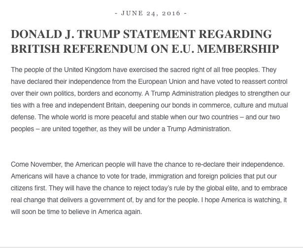 "Come November, the American people will have the chance to re-declare their independence," the Trump campaign said in a statement. "Americans will have a chance to vote for trade, immigration and foreign policies that put our citizens first. They will have the chance to reject today's rule by the global elite, and to embrace real change that delivers a government of, by and for the people." "I hope America is watching, it will soon be time to believe in America again." Asked by reporters in Scotland what he thought about the Brexit vote, Trump said the British people "took back control of their country. It's a great thing."