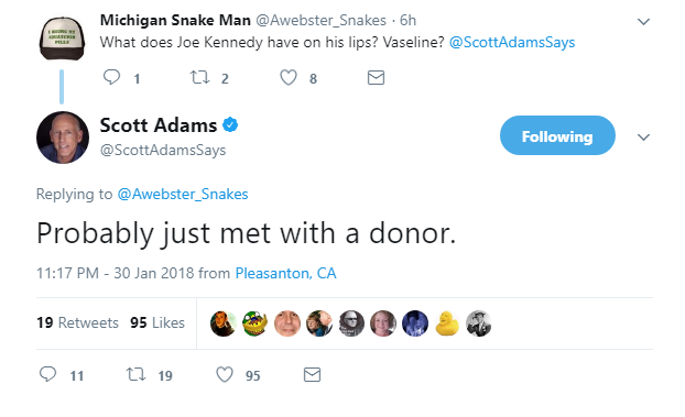 ![]() Sloppy Joe Kennedy gave a cringeworthy, overly dramatic speech after President Trump's State of the Union on Tuesday, unfortunately it was upstaged by his own drooling mouth. As Politico reported: Marco Rubio had his awkward pause for a gulp of water. Joe Kennedy had his ... drool?Regardless, it made for great memes: ![]() Scott Adams was particularly savage: Follow InformationLiberation on Twitter, Facebook and Gab. |