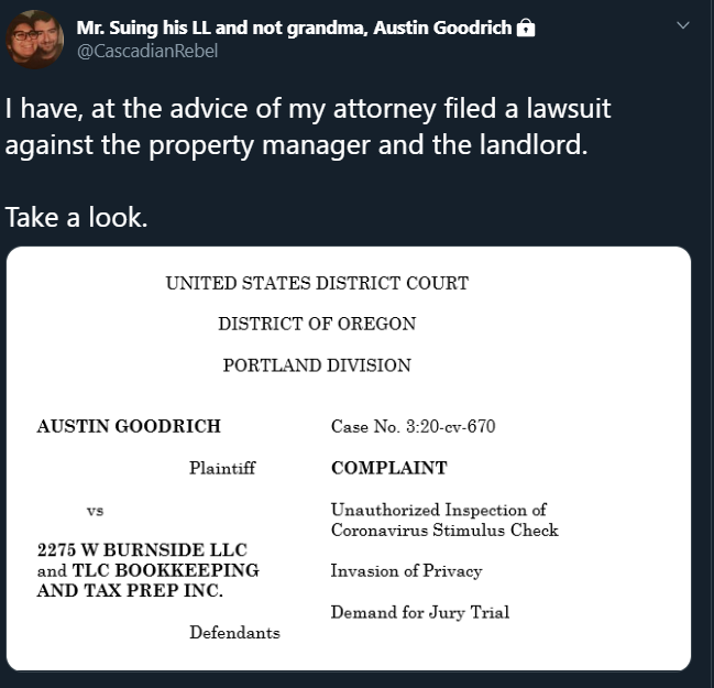 ![]() A militant antifa activist went viral recently for filing a complaint against his landlord for tracking his coronavirus stimulus check and demanding rent -- but he conveniently left out that the landlord is his grandmother. Austin Goodrich, 22, received an outpouring of sympathy for his situation after filing the lawsuit in Oregon on April 22. The complaint said that the actions of his landlord left him "feeling overwhelmingly violated and vulnerable." Goodrich was demanding that his grandmother waive all rent due until the end of his lease on June 30, waive all due and past-due amounts, return his security deposit and give him an excellent rental reference. Since she did not respond to his absurd requests, he filed a lawsuit. ![]() Goodrich tweeted that his landlord had text him hours after he received his stimulus money asking whether he planned to use it to pay rent. However, the defendant is not only his grandmother and landlord -- she is also his tax preparer. "Goodrich confirmed that TLC Bookkeeping and Tax Prep is run by his grandmother, but said he does not associate with her outside of their tenant-landlord relationship," local station KGW8 reports. Read More |