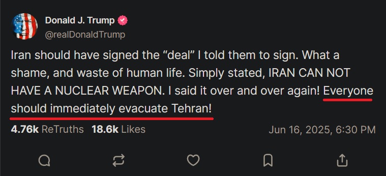 ![]() President Donald Trump, 79, issued his most psychotic threat to date on Monday by ordering the entire population of Tehran to "immediately evacuate."He followed his threat up by attacking Tucker Carlson and suggesting that fighting a war with Iran for Israel is the definition of "America First." "Iran should have signed the 'deal' I told them to sign," Trump said on Truth Social, ignoring that Israel attacked while negotiations were ongoing. "What a shame, and waste of human life. Simply stated, IRAN CAN NOT HAVE A NUCLEAR WEAPON. I said it over and over again!" "Everyone should immediately evacuate Tehran!" the president added. ![]() Tehran has a population of 9.8 million, with another 16.8 million in its metropolitan area. ![]() This is the equivalent of Russia or China ordering the immediate evacuation of the entire population of New York City (8.8 million) -- all while maneuvering a carrier strike group off America's coast. Trump is threatening the entire civilian population of Tehran that they'll face oblivion because their leaders didn't sign a horrible deal he presented them after he unilaterally tore up Obama's nuclear deal during his first term simply to please the late Israel First megadonor Sheldon Adelson for donating tens of millions of dollars to his campaign. ![]() By the Israelis' own account, Trump's "negotiations" were completely fake and were only done to "lull Iran into thinking an attack was not going to happen immediately."