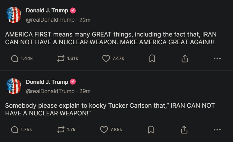Nonetheless, Trump is schizophrenically acting like his negotiations were clear-cut and totally legit, despite their being all over the place, totally ridiculous and most crucially still ongoing at the time of Israel's "preemptive" strike! If Trump controls his own Truth Social account, he's making the case for his own removal under the 25th Amendment. Last week, Trump issued an order to end his "mass deportations" (which he had barely even started) and now he's insisting fighting wars for Israel is the definition of "America First." "Somebody please explain to kooky Tucker Carlson that,' IRAN CAN NOT HAVE A NUCLEAR WEAPON!'" Trump said on Truth Social. "AMERICA FIRST means many GREAT things, including the fact that, IRAN CAN NOT HAVE A NUCLEAR WEAPON. MAKE AMERICA GREAT AGAIN!!!" ![]() The Atlantic reported on Saturday that Trump declared to them that he gets to decide what "America First" means. From The Atlantic, "Trump Says He Decides What 'America First' Means": When I caught Donald Trump by phone this morning, the president wanted to make one thing clear: "America First" means whatever he says it does. "Well, considering that I'm the one that developed 'America First,' and considering that the term wasn't used until I came along, I think I'm the one that decides that," Trump told me. "For those people who say they want peace—you can't have peace if Iran has a nuclear weapon. So for all of those wonderful people who don't want to do anything about Iran having a nuclear weapon—that's not peace."Putting the interests of Israel over the interests of America is as far from "America First" as one can get and yet that's become the entire focus of Trump's presidency. Just as with Trump's first term, he's breaking all his promises to his supporters while delivering for Israel in spades. If we weren't living under occupation, our leaders would be demanding an investigation into whether Trump has been compromised by Israeli intelligence. ![]() Follow InformationLiberation on Twitter, Facebook, Gab, Minds and Telegram. |