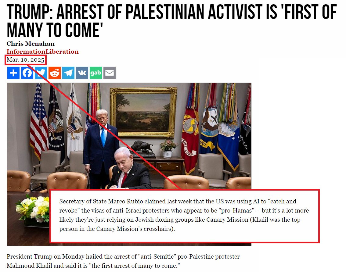 From Politico, "Trump officials used shadowy website to target pro-Palestinian academics for deportation, court records show": As the Trump administration identified pro-Palestinian academics to target for deportation, it relied heavily on an anonymously-run pro-Israel website that has been criticized for doxxing, according to newly unsealed court documents and testimony at an ongoing trial.Forgive me for tooting my own horn but I predicted this on day one. ![]() "Secretary of State Marco Rubio claimed last week that the US was using AI to 'catch and revoke' the visas of anti-Israel protesters who appear to be 'pro-Hamas' -- but it's a lot more likely they're just relying on Jewish doxing groups like Canary Mission (Khalil was the top person in the Canary Mission's crosshairs)," I noted back in March. Israeli-American multimillionaire Adam Milstein, who The Nation notes is "a convicted felon and close associate of the late multibillionaire Israel supporter Sheldon Adelson," was accused of running the Israeli doxing outfit Canary Mission in the undercover Al Jazeera documentary "The Lobby - USA." "Canary Mission acts as a key intelligence asset for the Ministry of Strategic Affairs, a highly secretive intelligence organization that is largely focused on the United States, and the Shin Bet security service," James Bamford reported in 2023 in The Nation. Jewish American pro-Israel activists Ann and Robert Fromer were also outed as donors to the Israeli doxing outfit earlier this year. Follow InformationLiberation on Twitter, Facebook, Gab, Minds and Telegram. |
