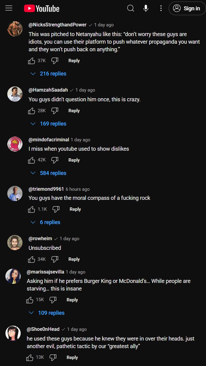 The interview, which I watched in full to clip, was nearly vomit-inducing with the amount of lies Netanyahu spewed with zero pushback. As I noted in the tweet above, that exchange about McDonald's was the only time they pushed back against him. Fortunately, the interview fell flat and everyone in the comments was calling them out. ![]() In a moment of panic, they held a live stream later in the day on Monday where they had on Nick Fuentes, Myron Gaines, Hasan Piker and Sneako as a mea culpa and promised to have a pro-Palestine activist on their podcast in the future to give a counter perspective. During the stream, Forgeard revealed that their interview with Netanyahu was set up by "someone from the communication team at the White House."