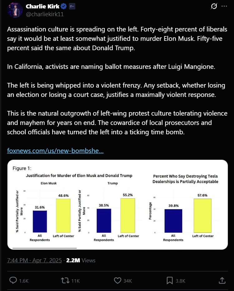 Kirk condemned "assassination culture" "spreading on the left" in a post from April that's being shared in the wake of his death: ![]()