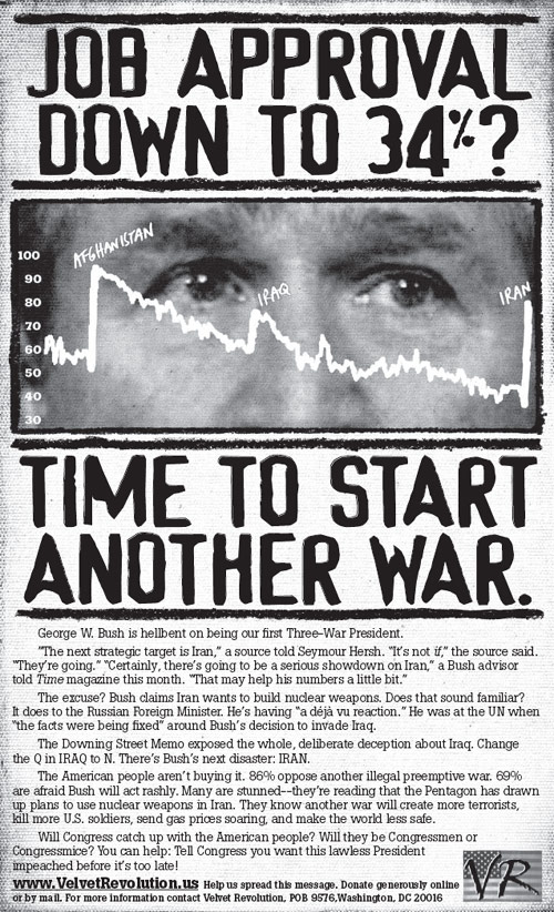 ![]() In a full page advertisement to appear in the New York Times Op-Ed section, a group is claiming that President George W. Bush hopes that war with Iran will boost his job approval. The ad, placed by Velvet Revolution, already appeared once in the Washington Post. This marks its first appearance in the Times. In it, the group quotes a Seymour Hersh claim that war with Iran is already considered an inevitability among those close to the current administration. It also features a chart indicating boosts to the President's job approval rating at the times of the Iraq and Afghanistan wars (although it places the Afghanistan invasion at his highest point of popularity, notably omitting 9/11,) insisting that Bush is "hell bent on becoming our first Three War President." ![]() |