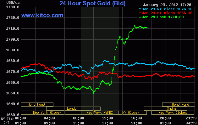 Gold spikes up $46.50, or 2.79% after the Fed says interest rates are unlikely to rise all the way through 2014.