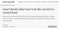 Israel Should Make Gaza 'Resemble Auschwitz,' Israeli Town Leader Says"Israel should be sending Palestinian Gazans fleeing the fighting to refugee camps in Lebanon, with the entire Gaza Strip being emptied and leveled and turned into a museum like the Auschwitz concentration camp in Poland, Metula Council head David Azoulai told 103FM," The Jerusalem Post reports.